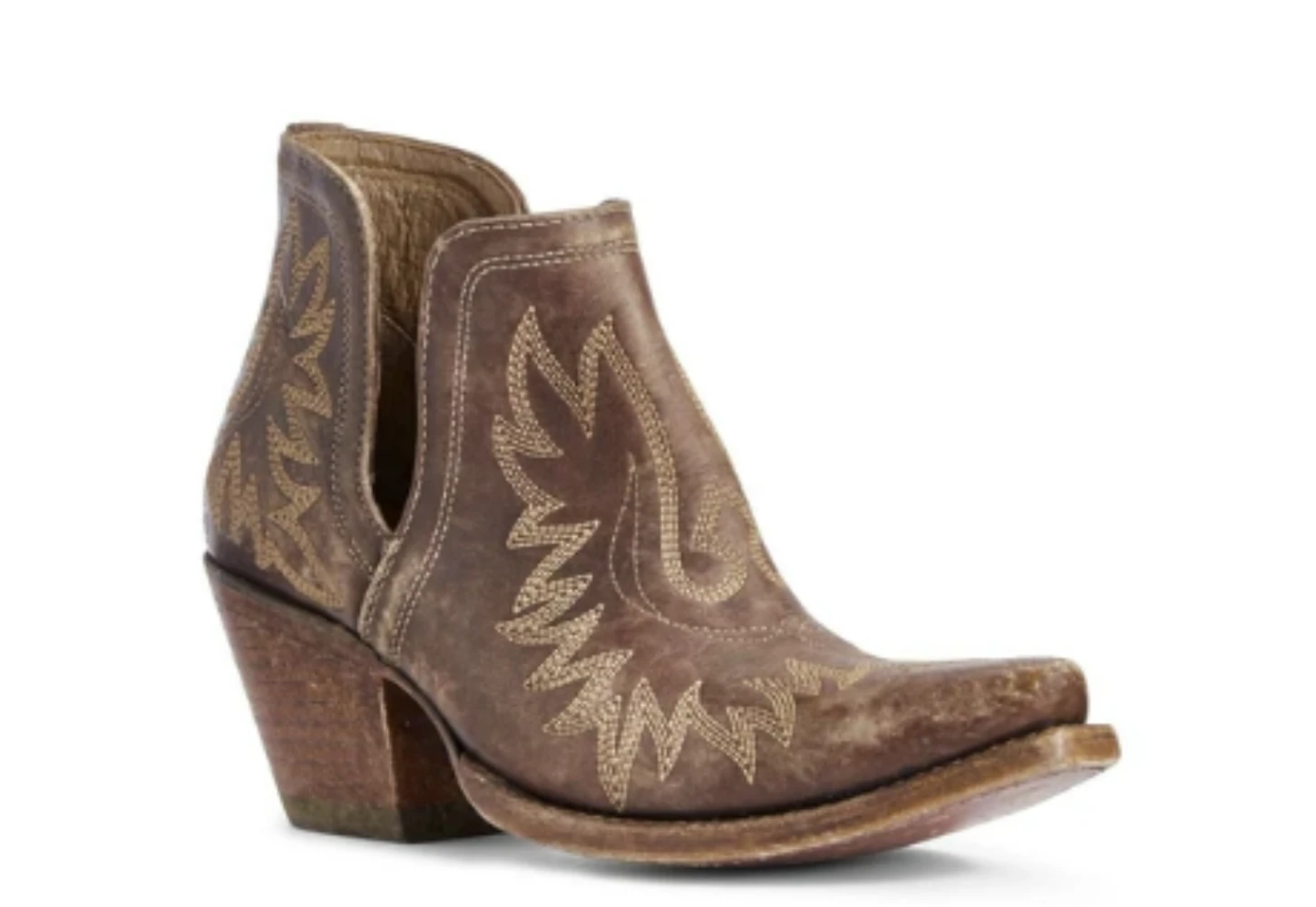 These western fashion booties are this seasons new thing! They feature a snip toe, brown stitching, and a single stitch welt. Pair these booties from Ariat with jeans that are cuffed at the bottom.