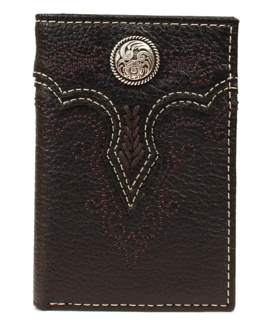 Rustic stitching lines the front of this handsome leather wallet, and a metallic embellishment offers Southwest-inspired appeal. With plenty of interior slots, organization is a breeze.