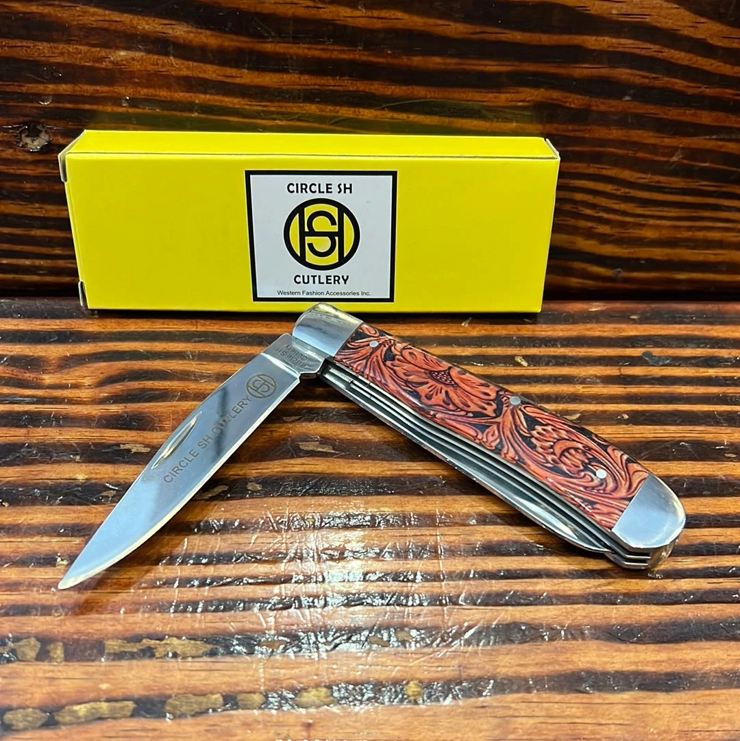 Circle SH Cutlery Acrylic Floral Tooled Leather Print Trapper Knife