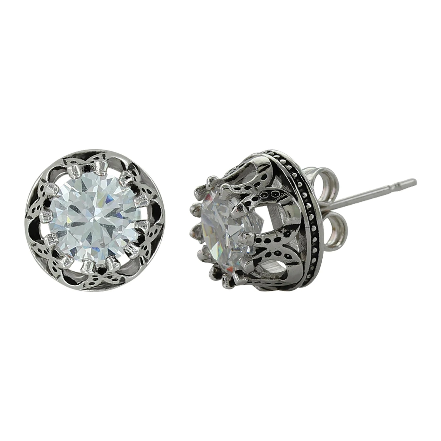 Rhodium plating over a brass base. Cubic zirconia. Montana Armor protective finish to prevent tarnish.