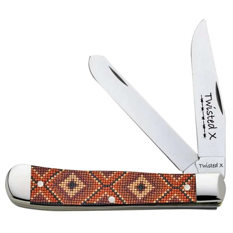 XK-307 Western Fashion Acrylic Trapper Brown Multi Knife Twisted X 4 1/4″ brown underlay. Double blade folding pocket knife
