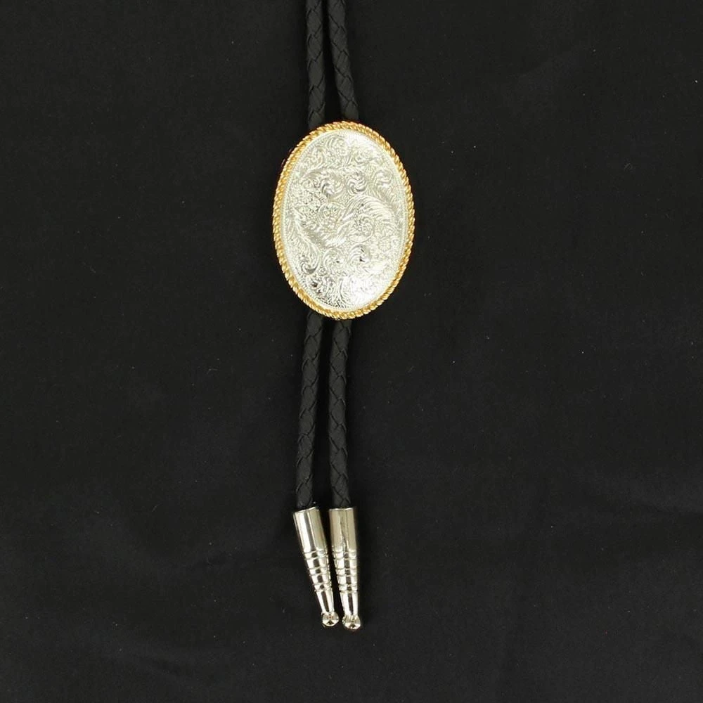 Western Mens Bolo Neck Tie Rope Edge Oval Silver Gold